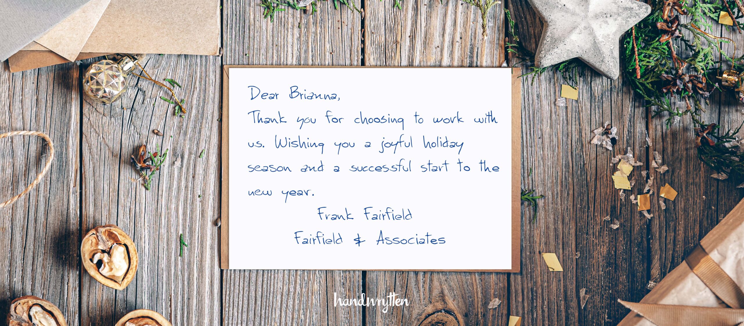 Don’t let this holiday season pass without showing your clients you care. With Handwrytten, sending personalized, professional, and beautifully handwritten business holiday cards is simple, scalable, and meaningful.