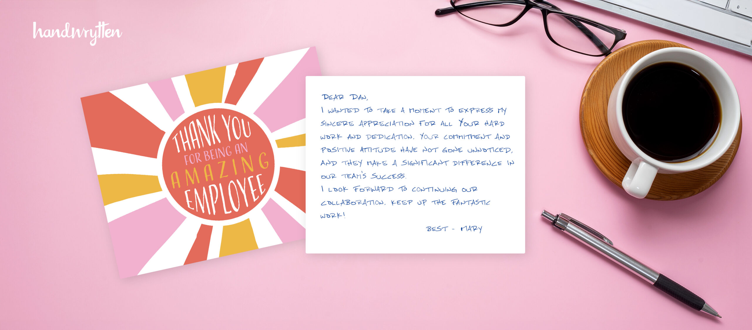 Are you ready to transform these thoughtful messages into beautifully penned notes that touch hearts deeply? Handwrytten is here to elevate your appreciation by turning digital texts into personalized, handwritten notes. With our seamless platform, you can select from a variety of stylish templates or create your own design to send a tangible piece of your gratitude and recognition.