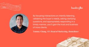 Don’t over-explain options or waste efforts solving problems the prospective buyer hasn’t raised. As a consumer, few things are more frustrating than time wasted and not feeling understood. By focusing interactions on intently listening, validating the buyer’s needs, asking clarifying questions, and appropriately responding in a timely manner, you’ll gain the trust and business of more clients.