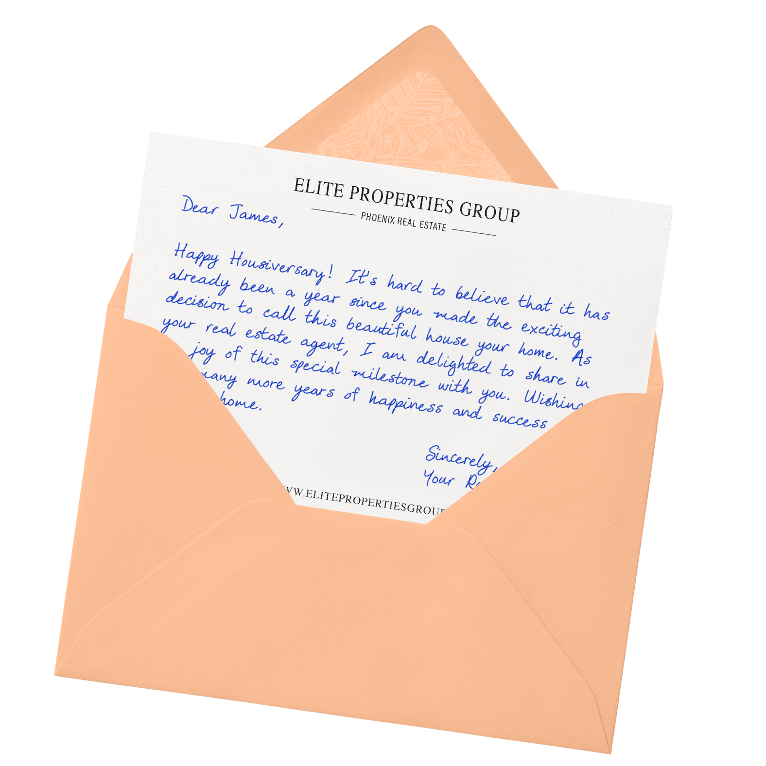 Send your real estate prospects a custom handwritten card featuring a recent sale, or your photo. You can even include your business card with every note.