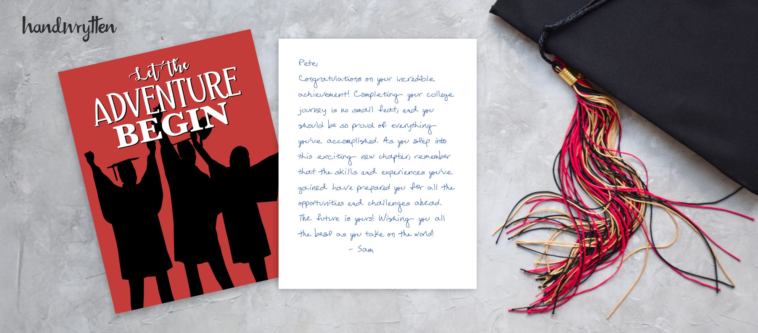 No matter what kind of message you choose to write, nothing beats the personal touch of a handwritten note. At Handwrytten, we understand the value of a heartfelt message, and we make it easy to send personalized handwritten graduation card messages that will truly stand out. Whether you’re writing a simple congratulatory note or sharing motivational advice, a handwritten card shows the graduate how much you care.