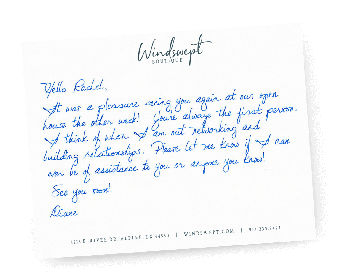 Handwrytten makes it easy to send business thank you cards. Using the web site, it just takes a few minutes to select a card, type a message and select a handwryting style. It all looks so natural, right down to the stamp. I never have to handwrite again!